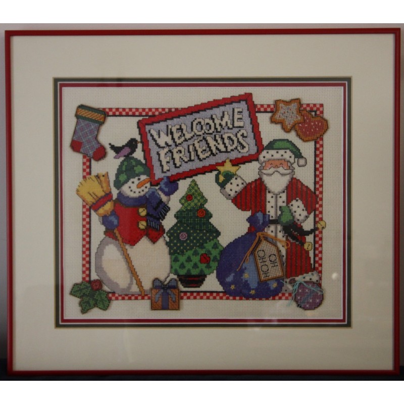 Quadro em tecido branco com moldura vermelha.